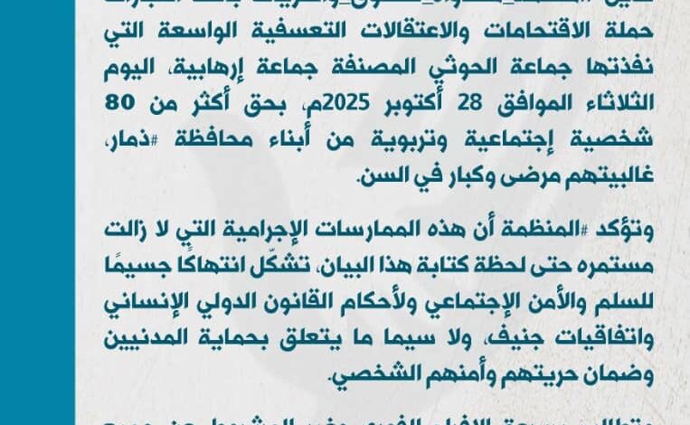 أفادت منظمة “مساواة” للحقوق والحريات أنها وثقت قيام جماعة الحوثي المصنّفة إرهابية بـ “اعتقال” أكثر من 80 شخصية اجتماعية وتربوية خلال حملة اقتحامات في محافظة ذمار (وسط اليمن) اليوم الثلاثاء 28 أكتوبر/تشرين الأول.